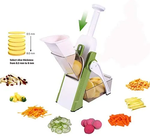 *Convenience and Versatility: It's an all-in-one vegetable chopper which performs perfectly for slices, strips, julienne, and dicesNo need to change blades, just rotate the knobs and press the handle, you can cut various veggies and fruits into the shape and thickness you want The thickness ranges from 02mm to 8mm Besides,no tedious cleaning work, you can just rinse it under the water,and use the brush we provide to remove the residues